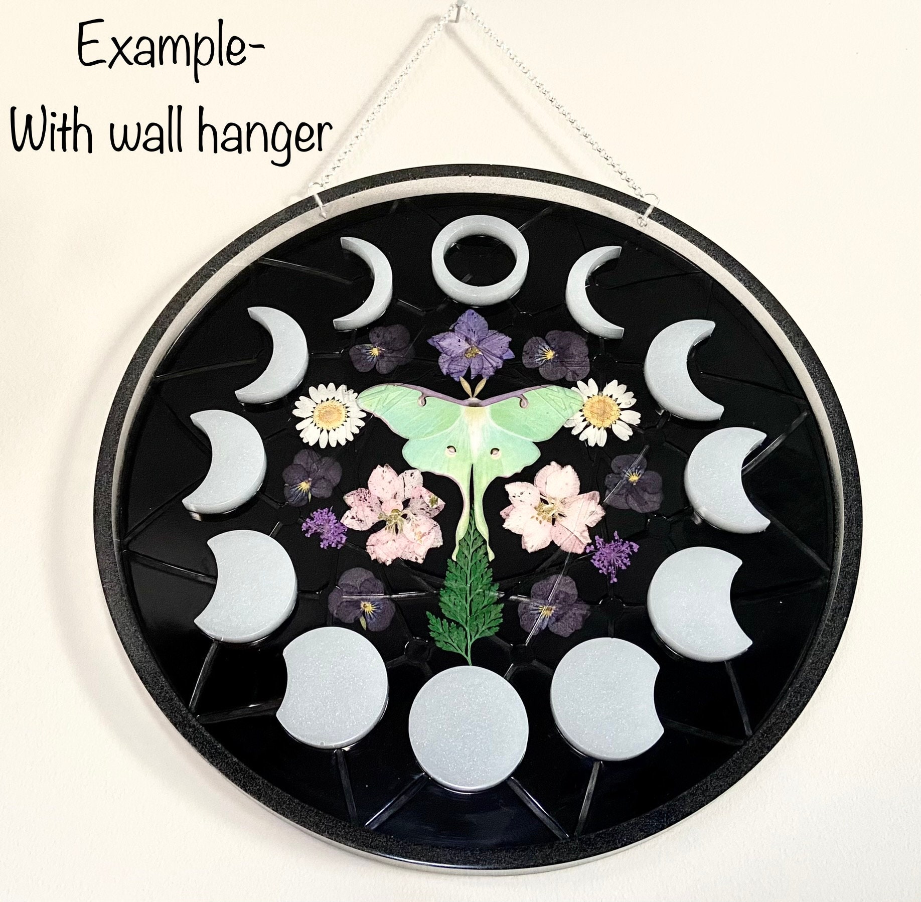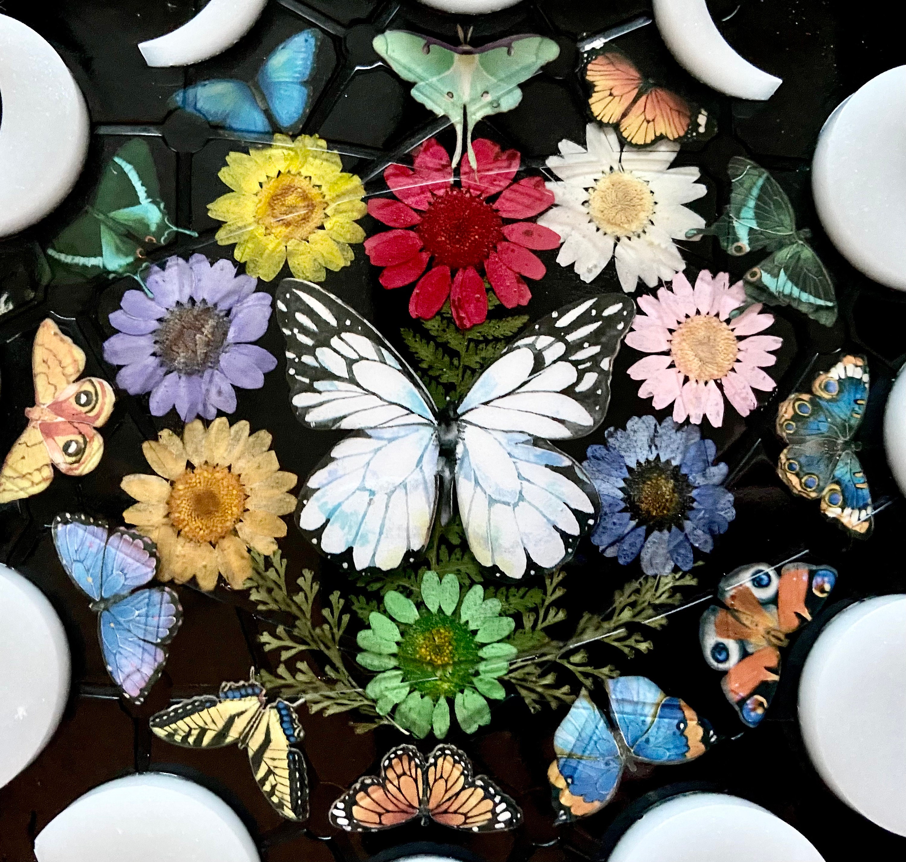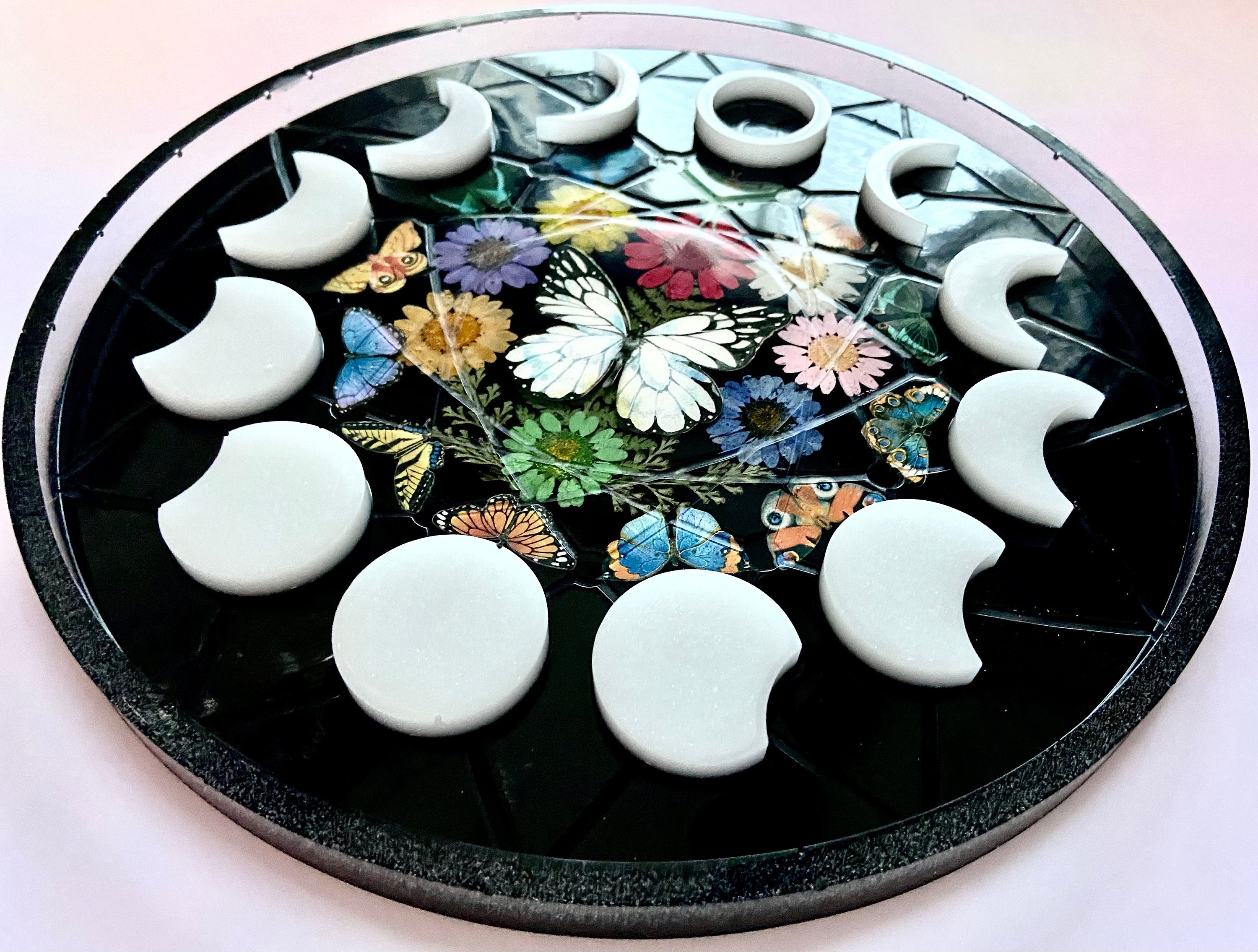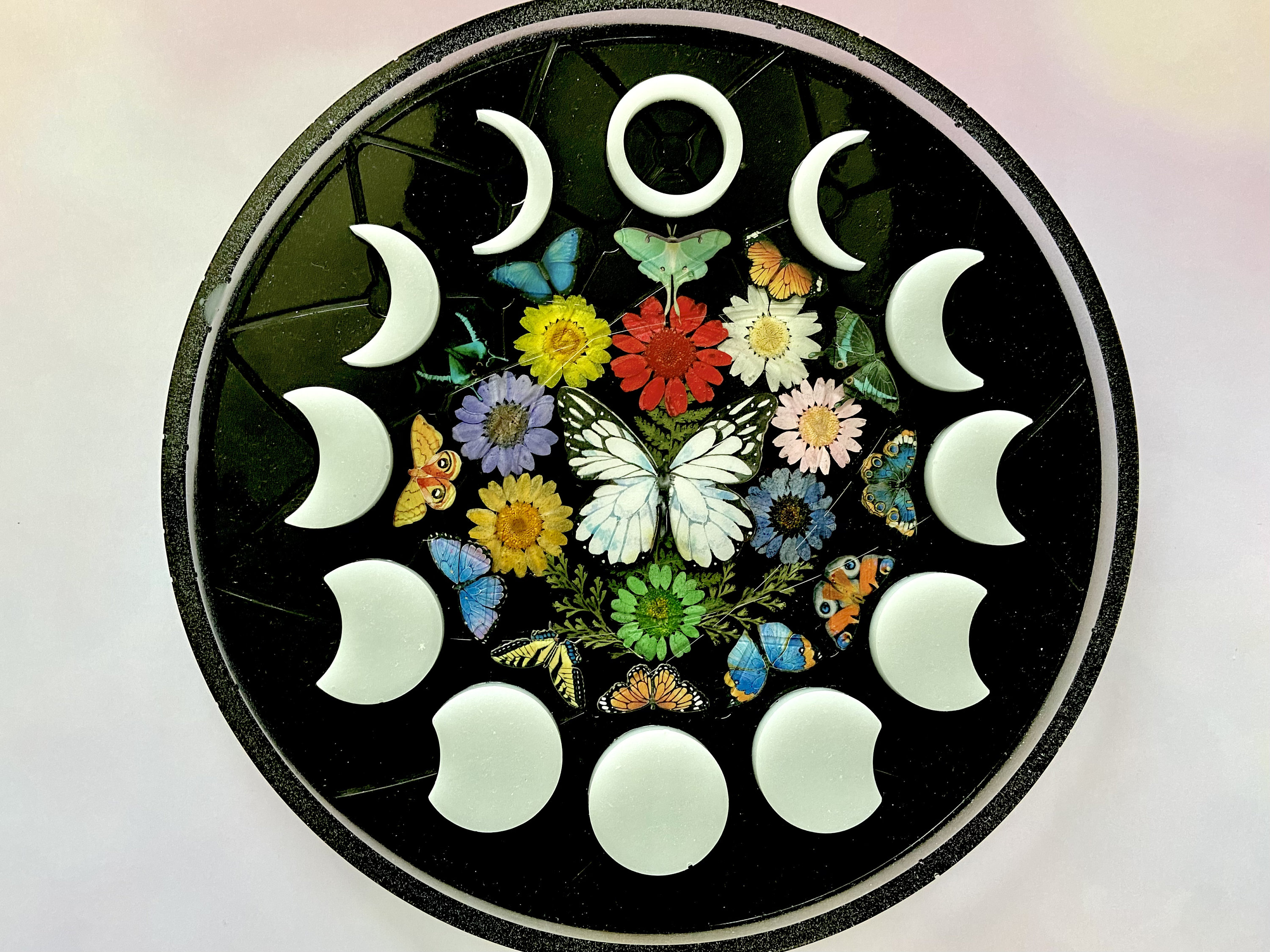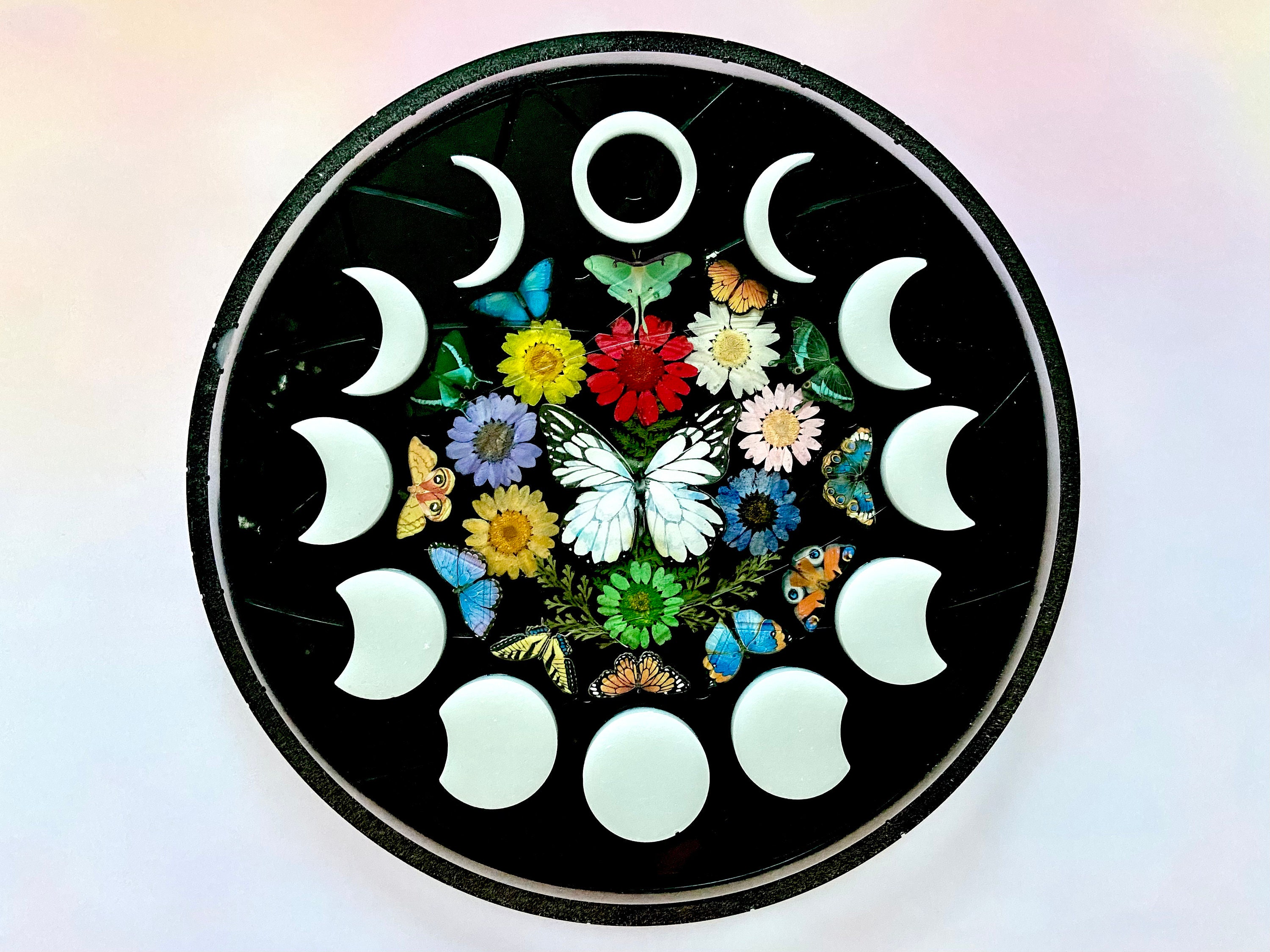 This black and white Pieridae butterfly moon phase tray features the phases of the moon and centered is a pearlescent photorealistic butterfly die-cut surrounded by 12 mini butterflies and moths and real dried flowers and ferns. 10” round.