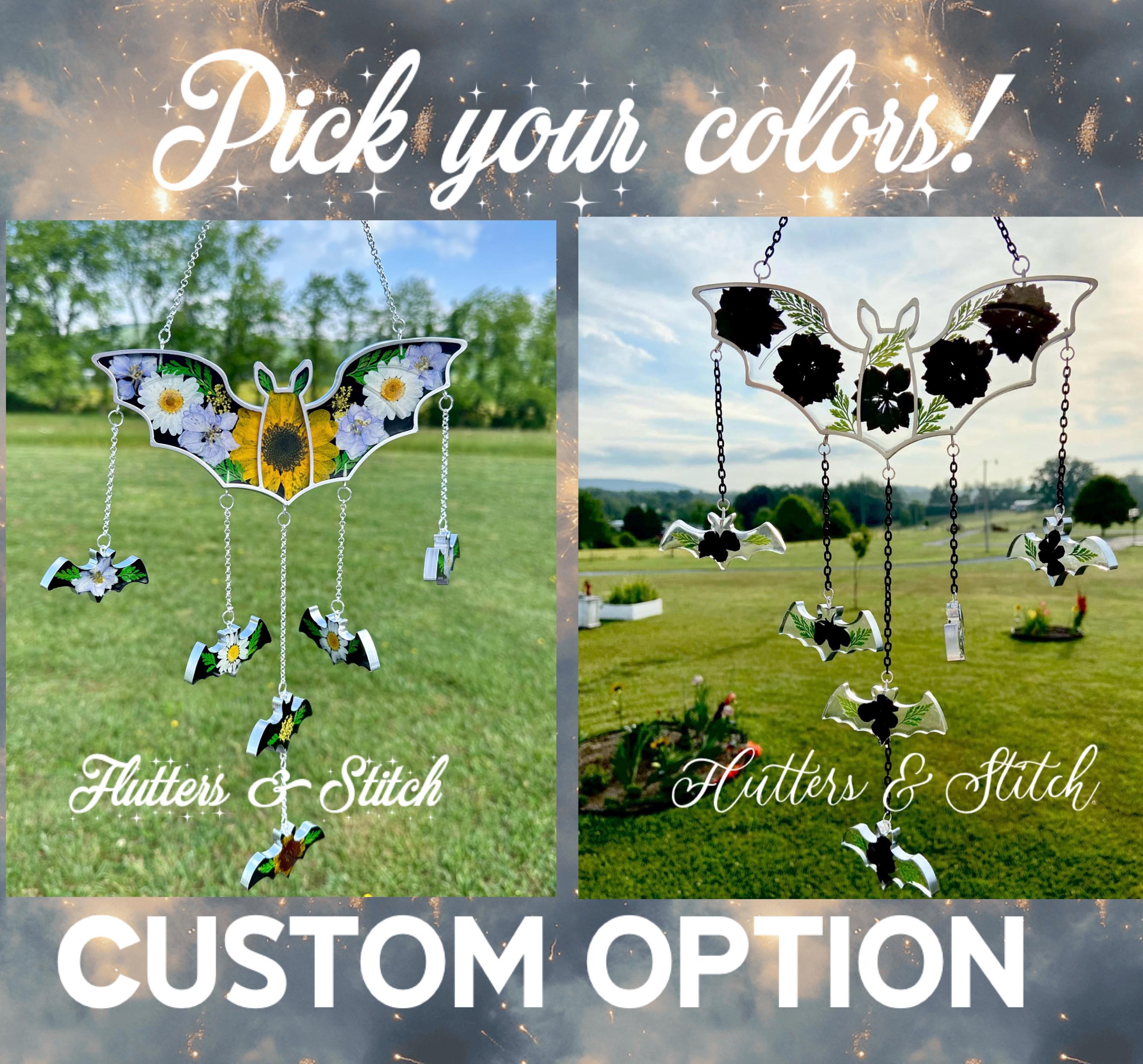 These beautiful handcrafted bat Suncatchers feature real dried flowers. They have 6 mini bats attached and are made of lightweight resin. They are 13” x 7” and feature a black chain.