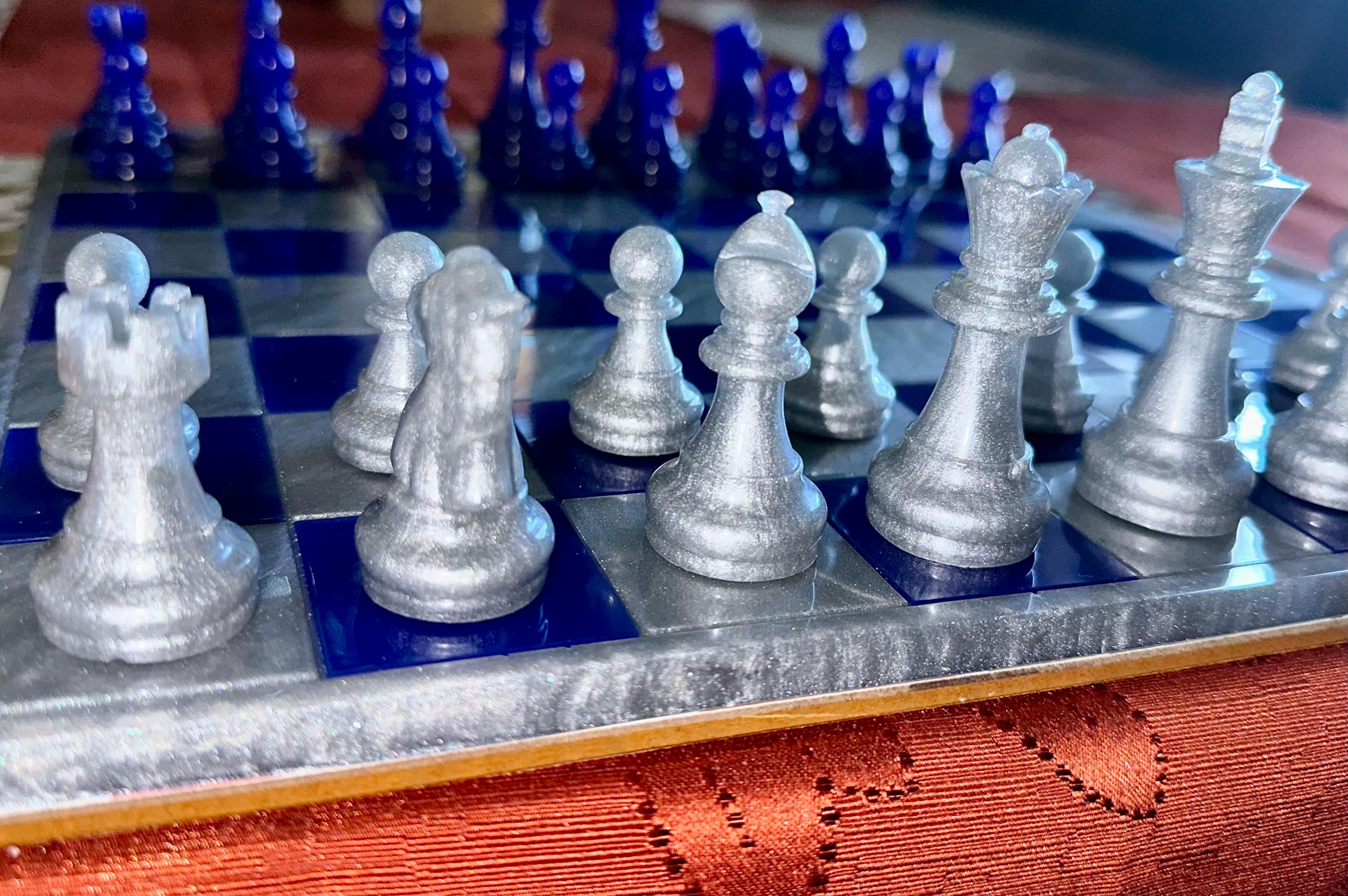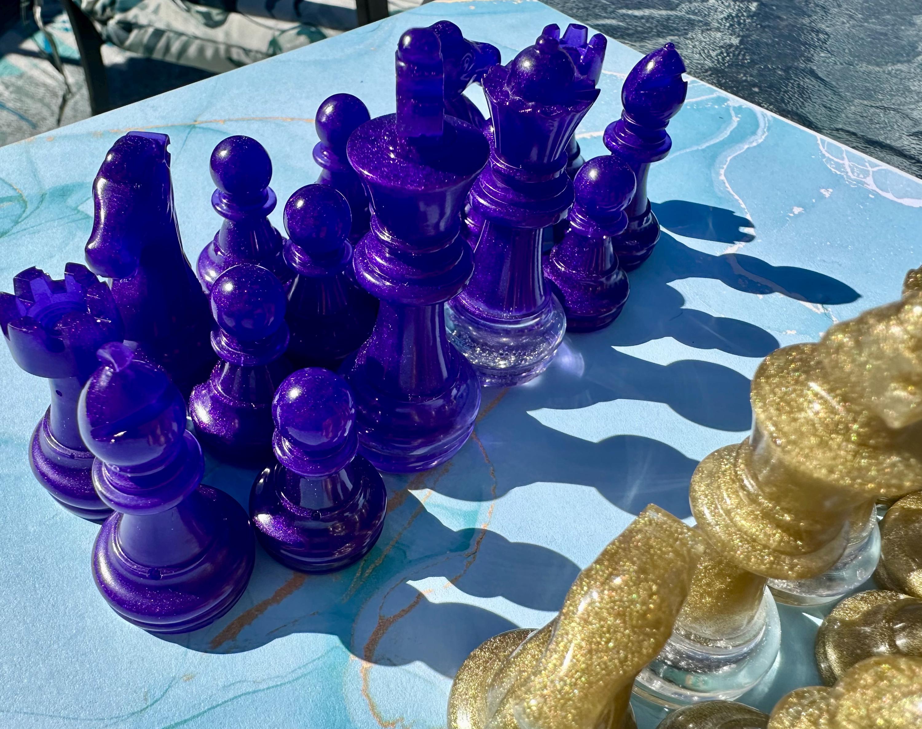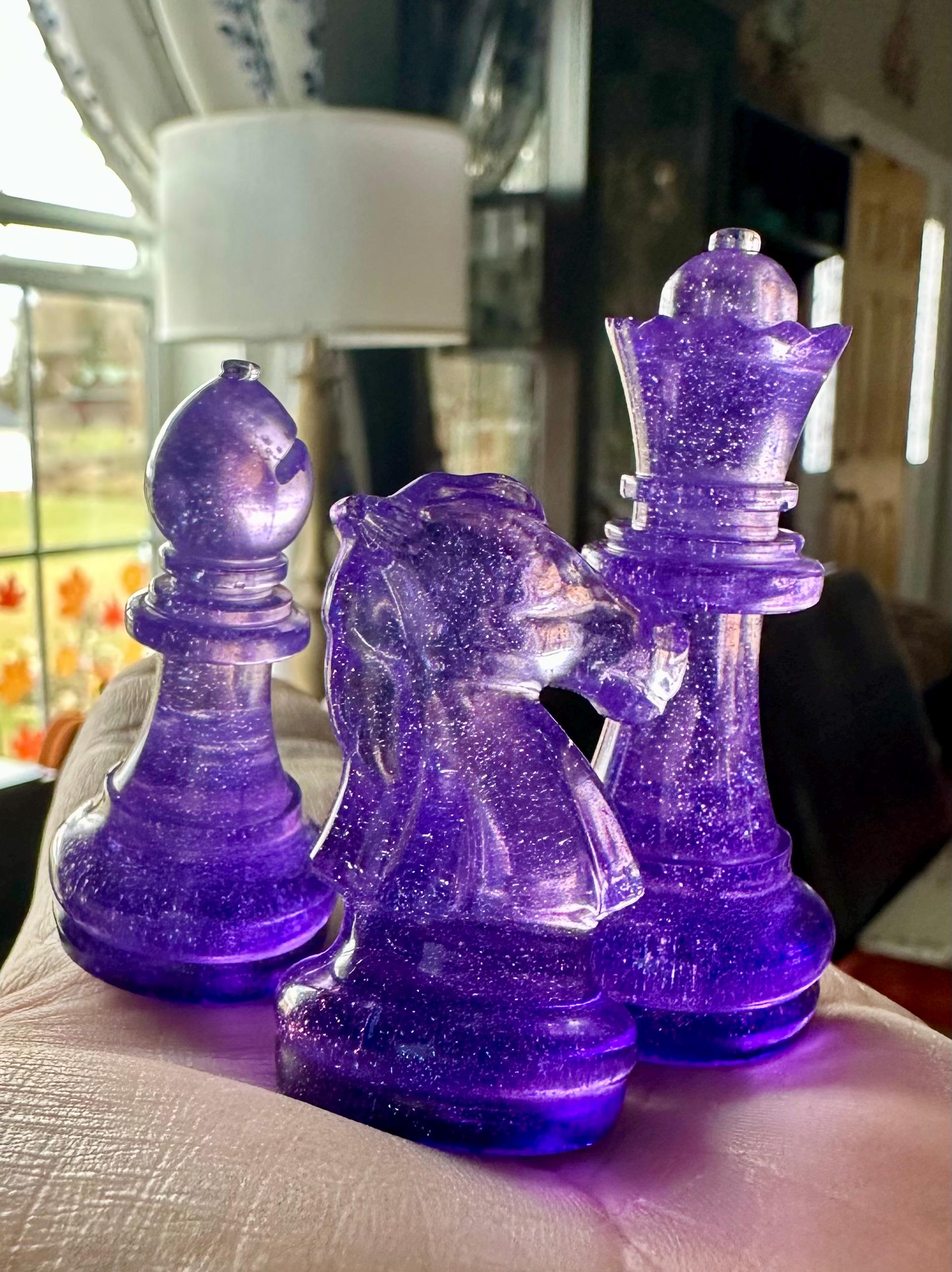 My chess set turned out beautiful! I asked for one green and one clear with silver flakes and ferns, for a forest vibe. The seller was super responsive and happy to accommodate the request. I was away when they arrived but tracking showed they came in a timely fashion. Remarkably quick, easy, and reasonably priced for a custom resin chess set. I’m excited to give it to my daughter!