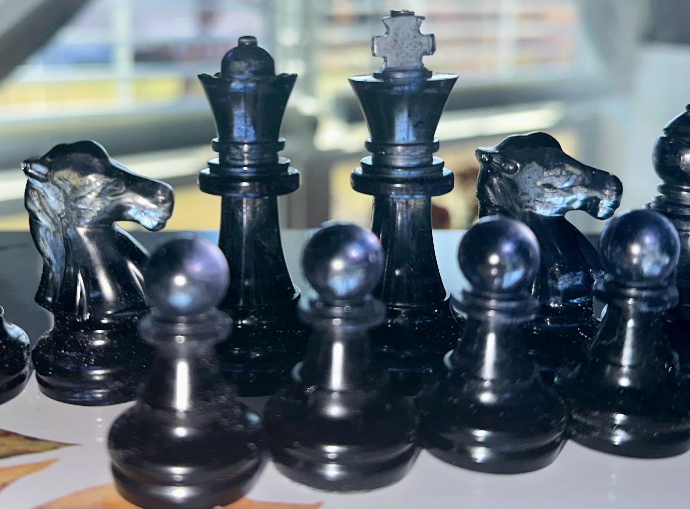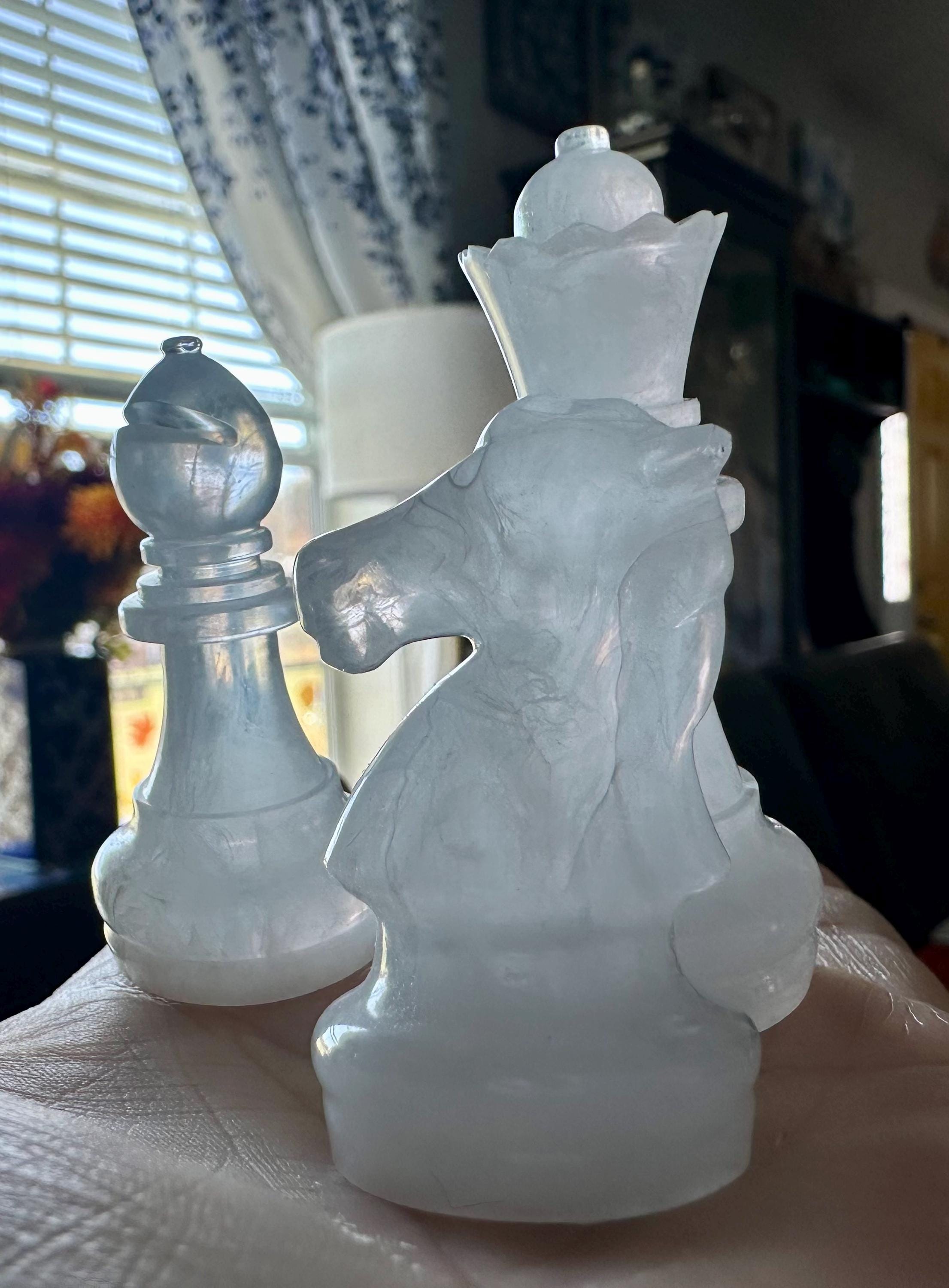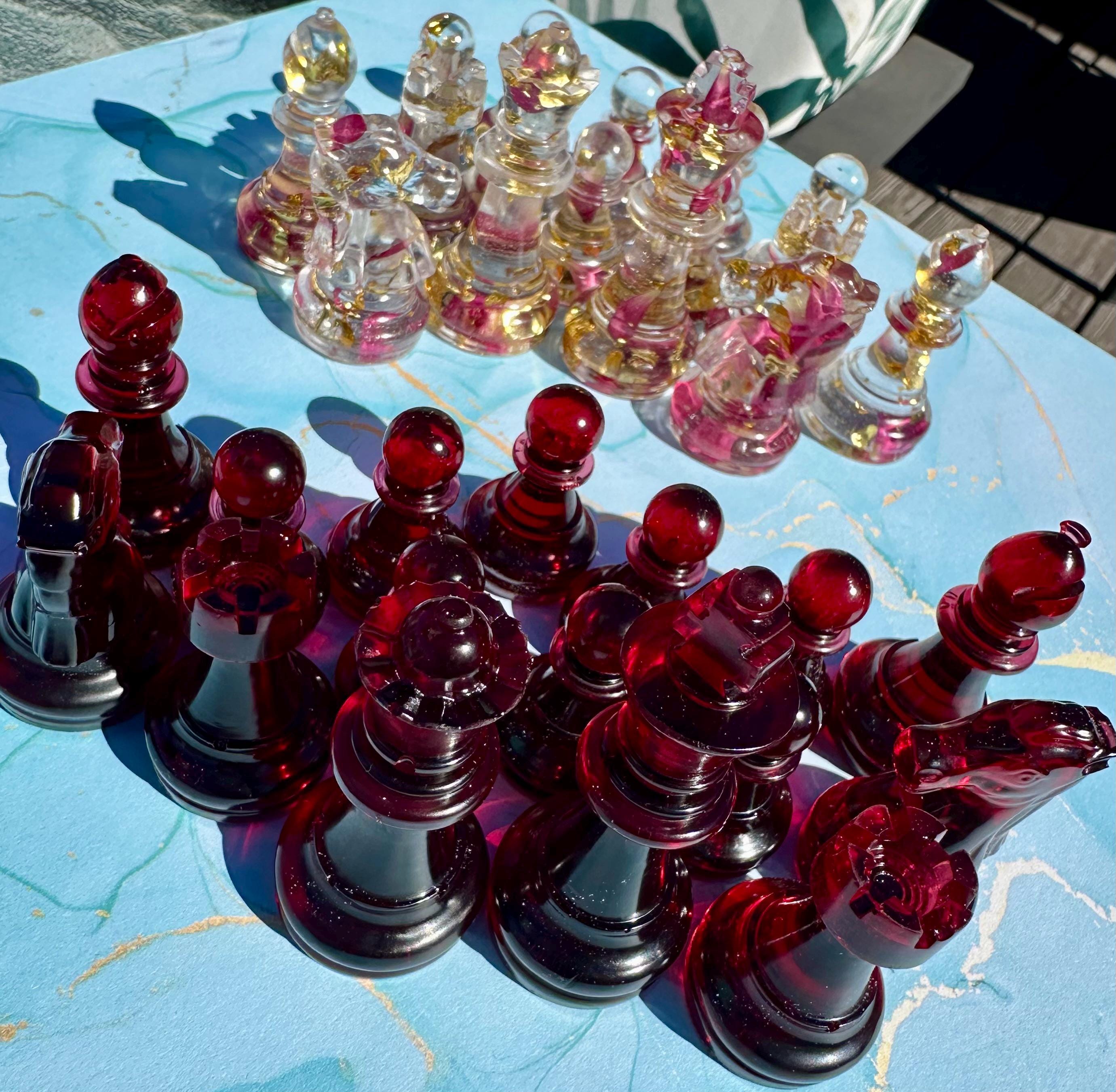 My chess set turned out beautiful! I asked for one green and one clear with silver flakes and ferns, for a forest vibe. The seller was super responsive and happy to accommodate the request. I was away when they arrived but tracking showed they came in a timely fashion. Remarkably quick, easy, and reasonably priced for a custom resin chess set. I’m excited to give it to my daughter!