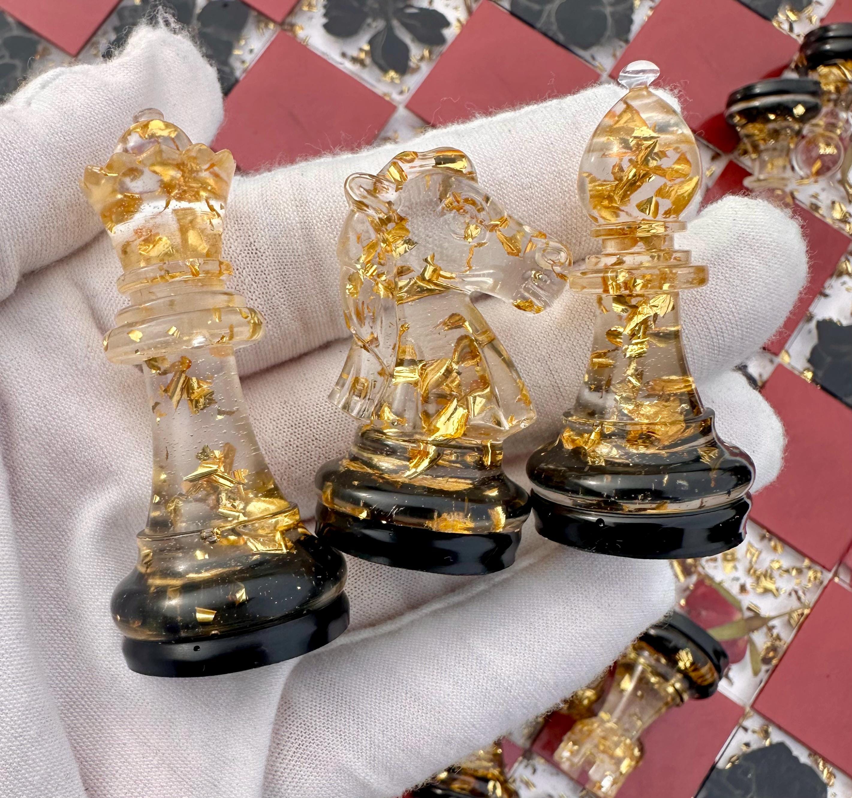 The 32 chess pieces are a stylish mix of glossy metallic wine-red with gold flake bases, alternating with clear pieces featuring gold flakes and black bases, each with a soft felt bottom to keep your board scratch-free.