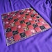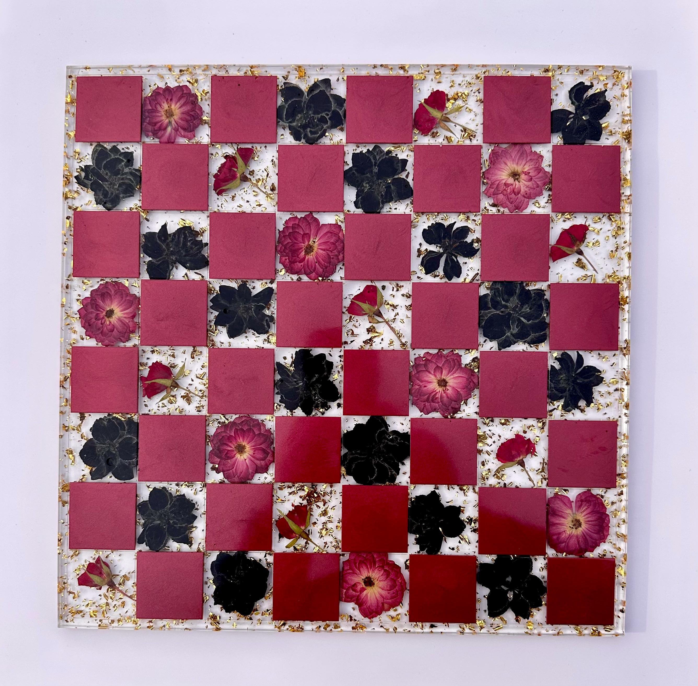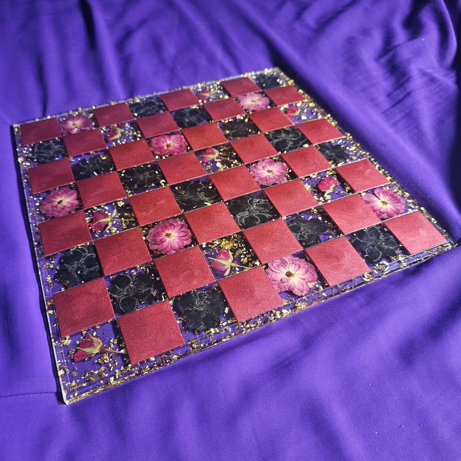 The alternating squares feature 32 real, dried red roses and black larkspur flowers. Each alternating square showcases a deep, metallic wine-red shade, and the crystal-clear base is highlighted with real, heavy gold flake.